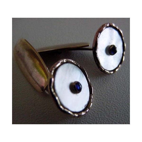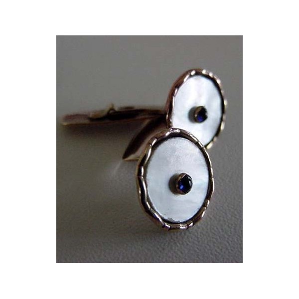 Denmark Fine old-fashioned pair of cuff-links, gold-wash surface, mother of pearl disk with saphire cabochon in bezel in the center