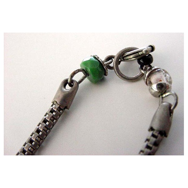1960s, signed by single black pearl, silver color chain with green + light pink pearls, disks and ribbon bars