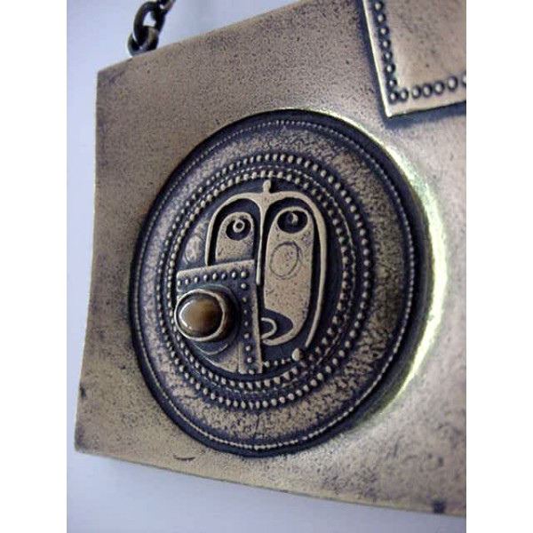 5.5 x 6 cm x 0.4 cm wide the pendant! (1“=2.54 cm) Pendant fixed to matching necklace (2x32 cm long). Tiger's eye cabochon in straight face pattern. Relief textured surface. Rare modernist item!