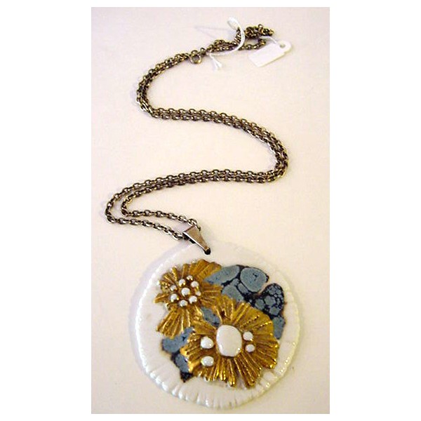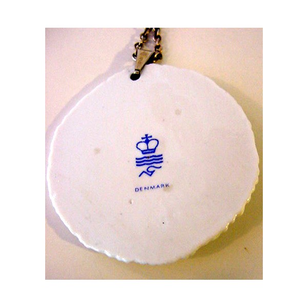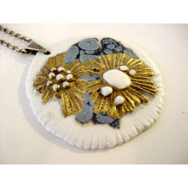 SOLD - Royal Copenhagen, Denmark White Porcelain Pendant with gold+grey relief decoration + matching silver chain