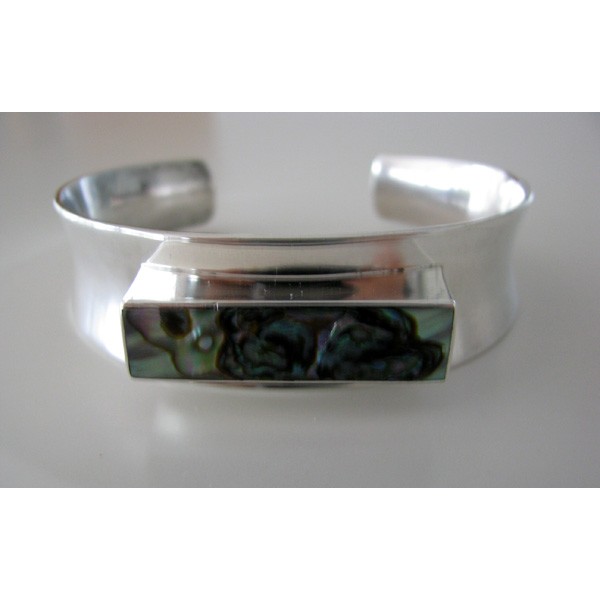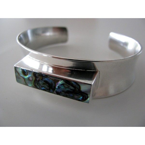 Cove curved cuff, tapered with central superstructure into which is set an oblong of polished abalone shell; Elegant Danish modern design, sleek and smooth